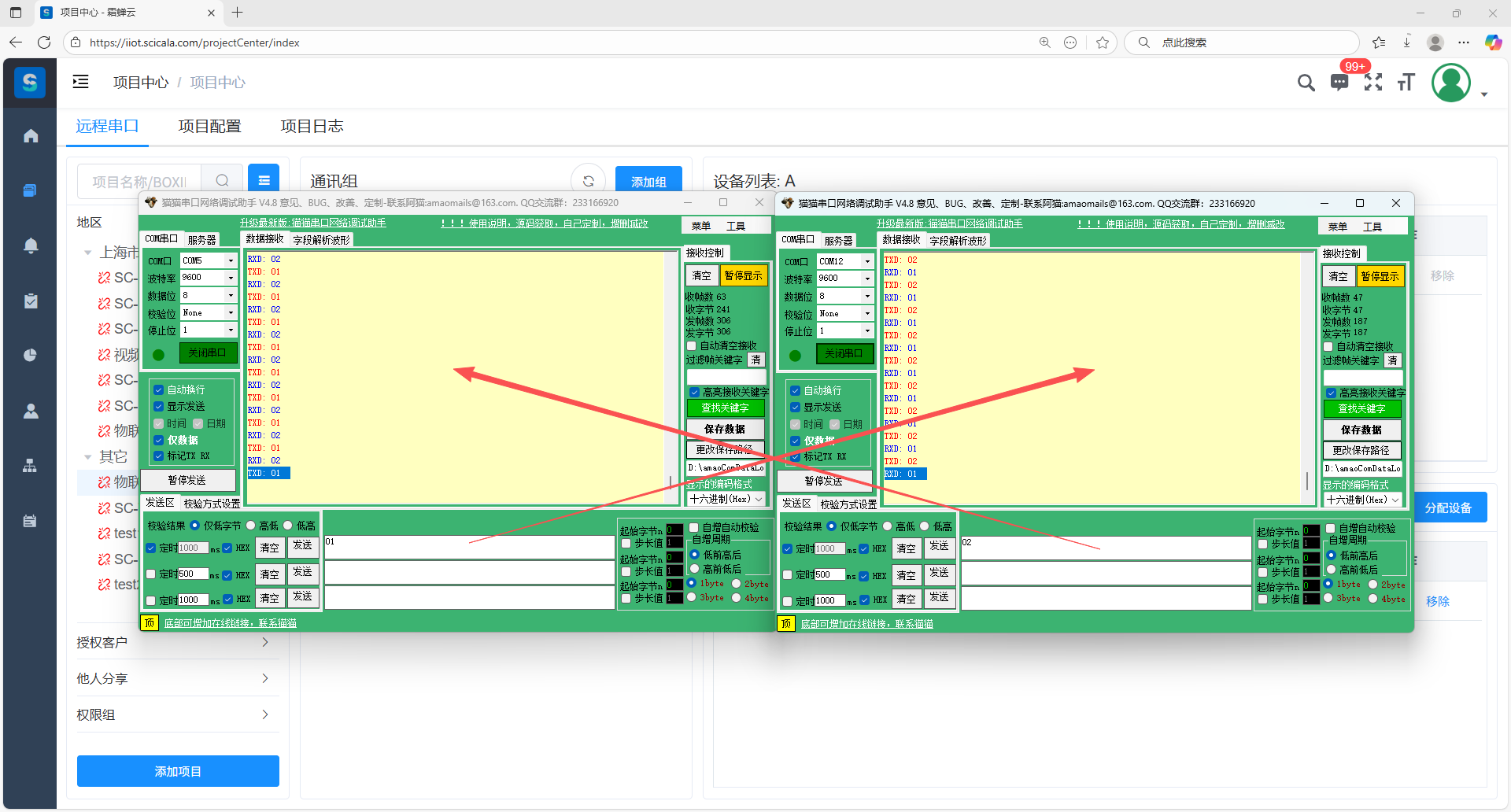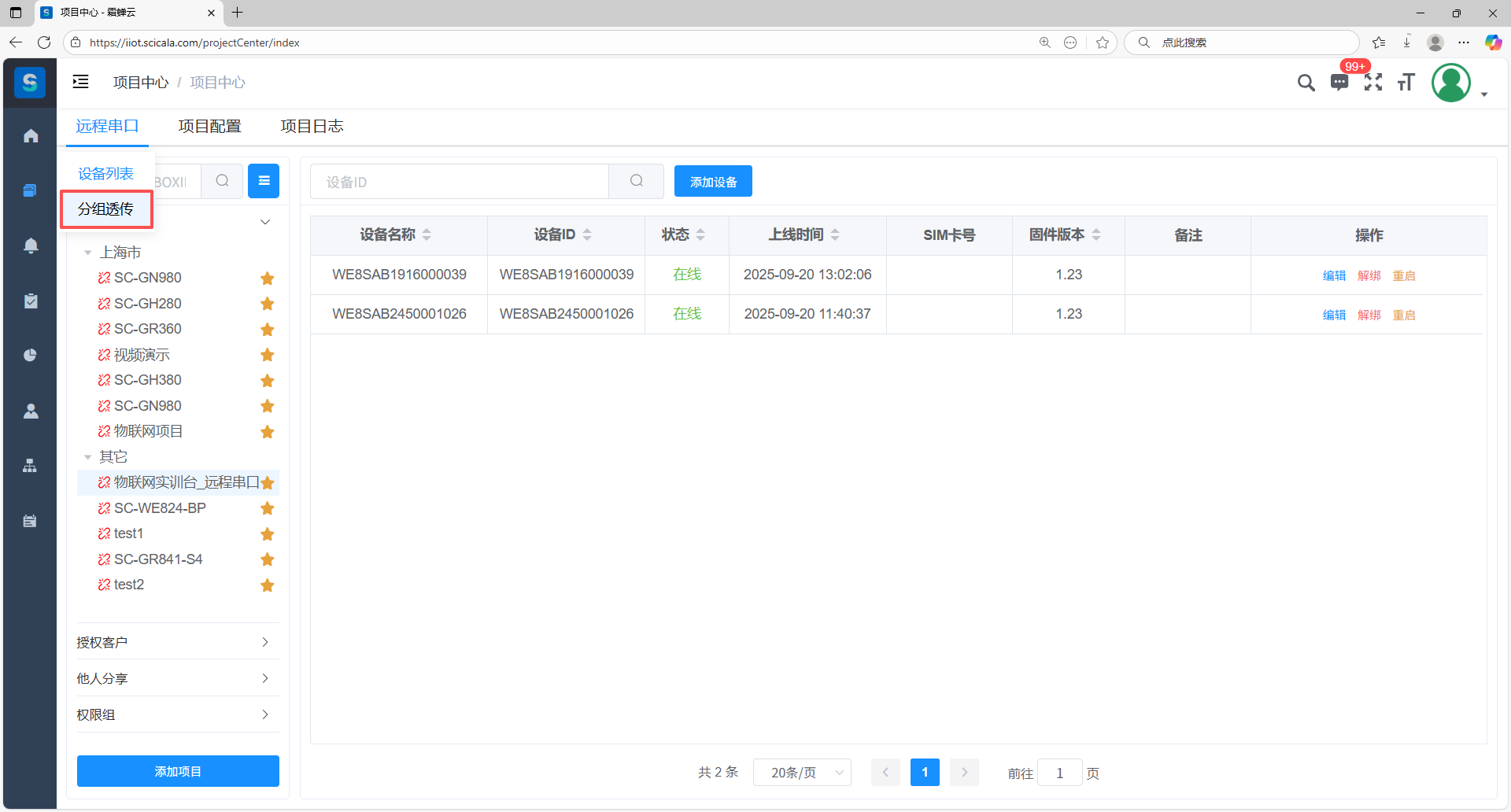 选择串口项目,点击透传分组