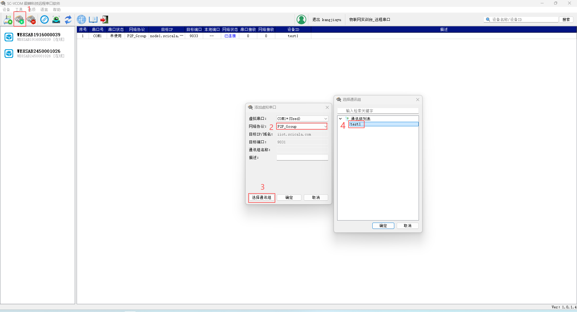 打开远程串口软件,点击添加虚拟串口,选择虚拟串口号,网络协议,点击选择通讯组,选择上面建立的通讯组,确定。