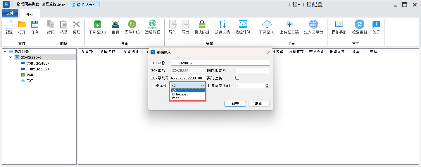 BOX插入物联网卡(出厂自带物联网卡),安装4G天线,设置上网模式:4G。