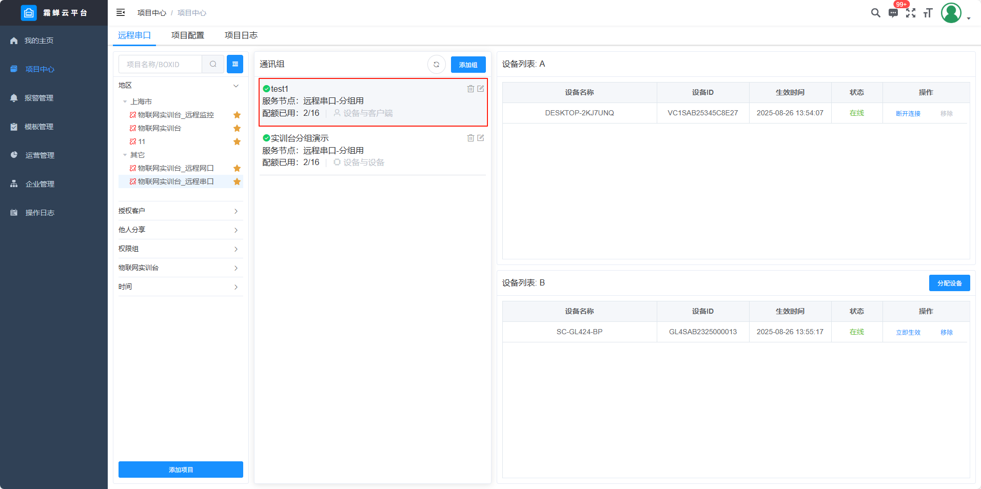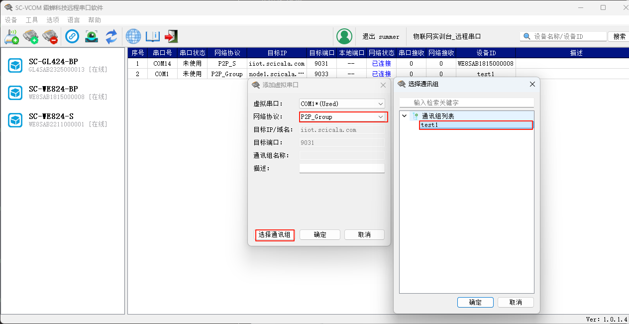 若选择分组通信协议,须先在霜蝉云平台设置通讯组test1,把设备添加进通信组。