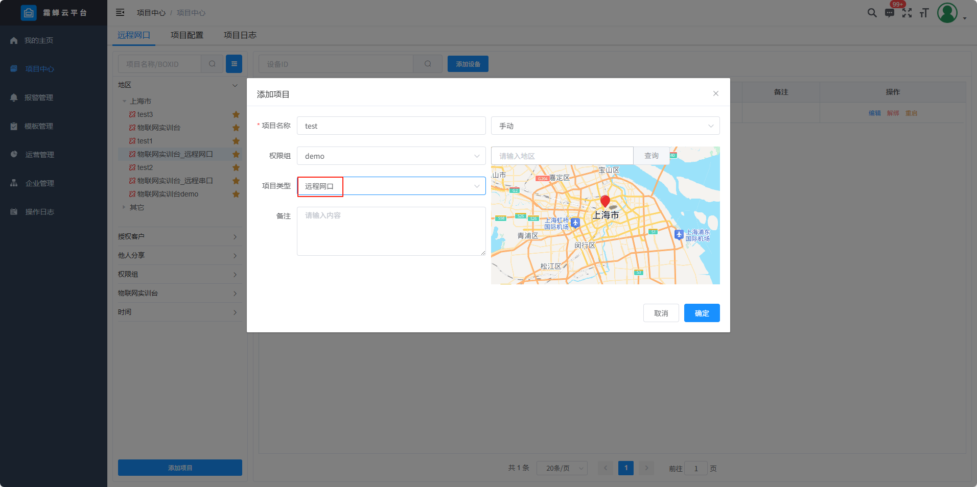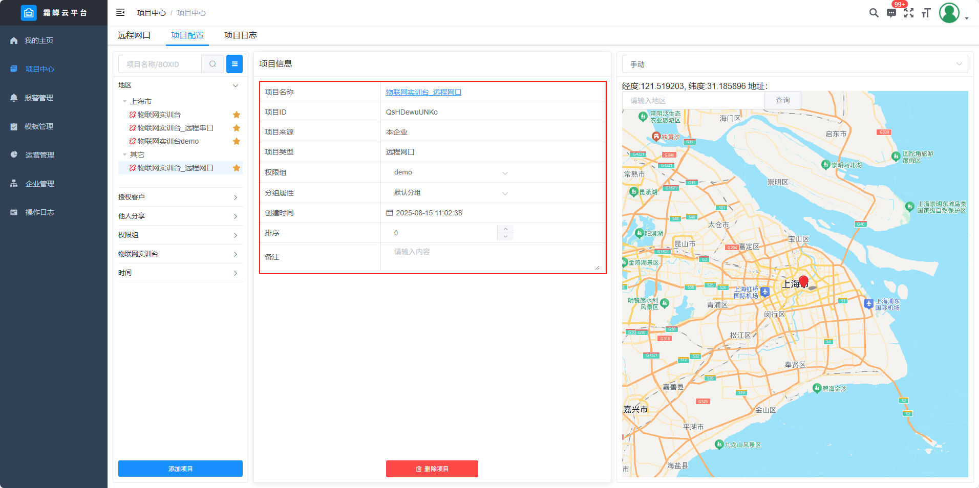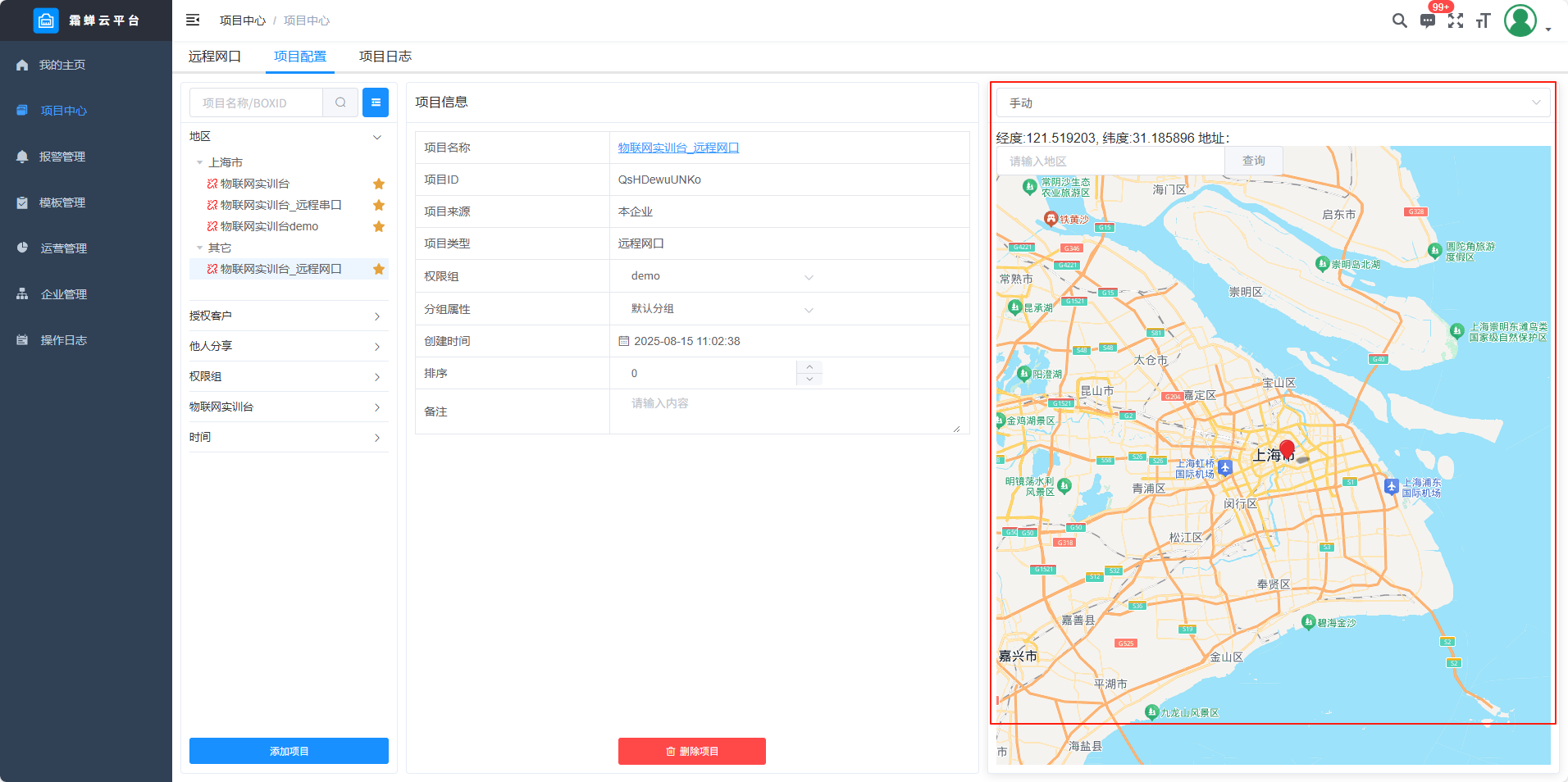 目录 搜索 展开 标准功能云网关系列入门使用流程客户端软件使用说明SC-EdgeConfig路由器功能交换机功能固件升级功能远程编程功能数据采集功能模块防拆功能数据交换功能边缘计算功能OPCUA数据转发MODBUS数据转发IOT功能数据格式default.jsSCIoT.jsTlink.jsOneNET.jsOneJSON.jsAliyun.jsBaidu.jsSC-VCOMSC-SCLink云平台使用说明我的主页项目中心远程串口远程网口远程监控报警管理模板管理运营管理客户管理企业管理操作日志消息中心云组态使用说明准备工作名词解释元素属性分类功能使用新建画面插入背景图片设置背景色插入静态文本显示动态文本指示灯按钮控制(图片按钮)字按钮控制(图片按钮)矢量按钮控制图形变色棒图仪表盘数码管超链接水流效果自定义图库画面跳转实时曲线历史曲线报表报警数子钟视频监控时钟动态文本滚动播放表格批量控制控制变量显示变量数值自定义脚本BOX系列说明SC-GH280使用说明SC-GH380使用说明SC-GH360使用说明API文档token接口基础数据获取项目获取BOX获取设备获取变量数据接口实时数据变量控制获取历史数据获取所有报警活跃报警确认历史报警删除获取报警确认记录获取报警历史记录组态接口获取组态画面OPCDA使用说明OPCUA和MODBUS数据服务视频教程SC-GH380采集西门子串口PLC数据SC-GH380远程编程西门子S7-200-SMART PLCSC-GH380远程编程三菱串口PLCOPCUA数据转发Modbus数据转发边缘计算 暂无相关搜索结果! 阅读次数:65 本文档使用 SchipsDoc 发布 远程网口 远程网口项目中心——添加项目——添加远程网口设备列表智能组网项目配置项目信息 查看及修改项目信息项目名称、权限组、项目状态、创建时间、排序、项目位置和备注。 手动定位在地图上点击位置或者是直接搜索地址。 删除项目项目日志作者:霜蝉科技 创建时间:2025-08-22 08:49最后编辑:scicala 更新时间:2025-09-01 11:09 上一篇: 远程串口下一篇: 远程监控