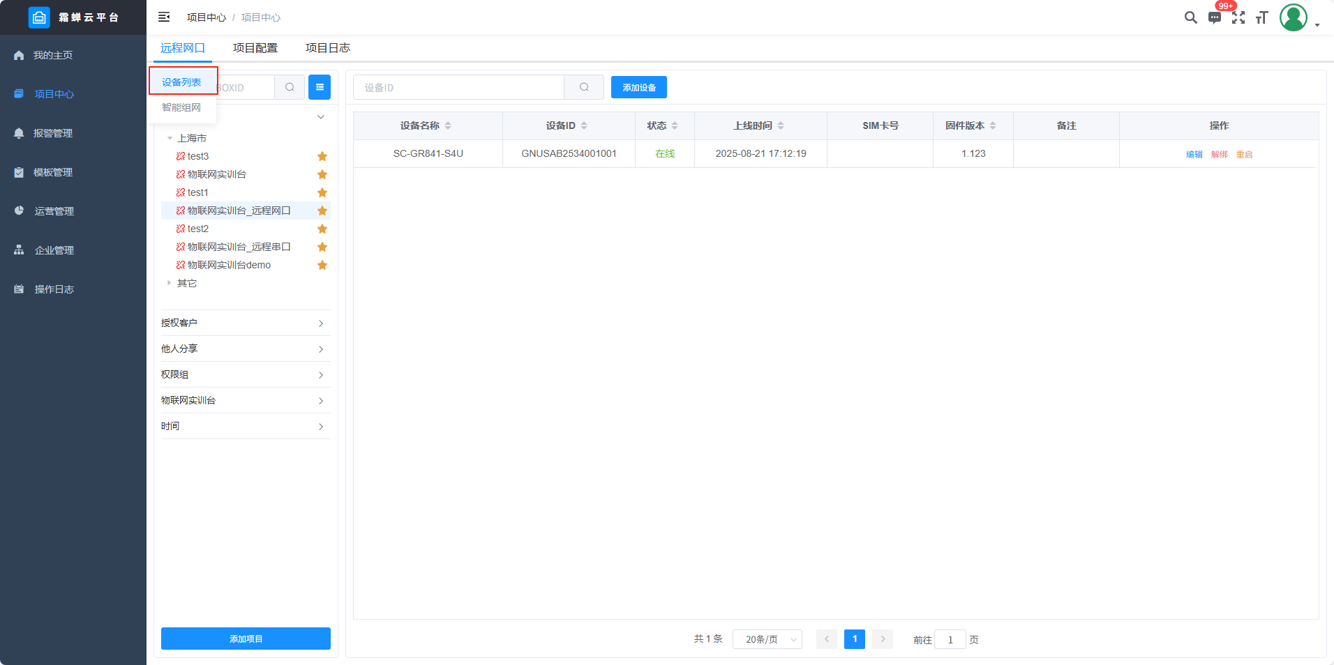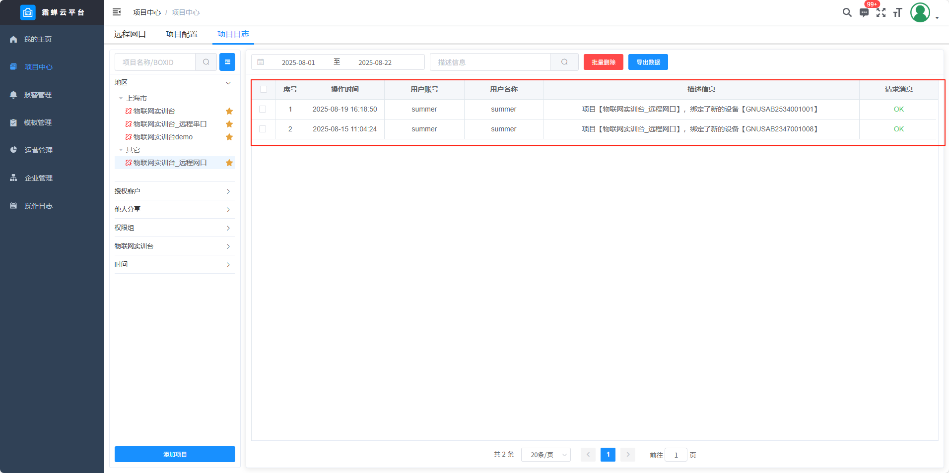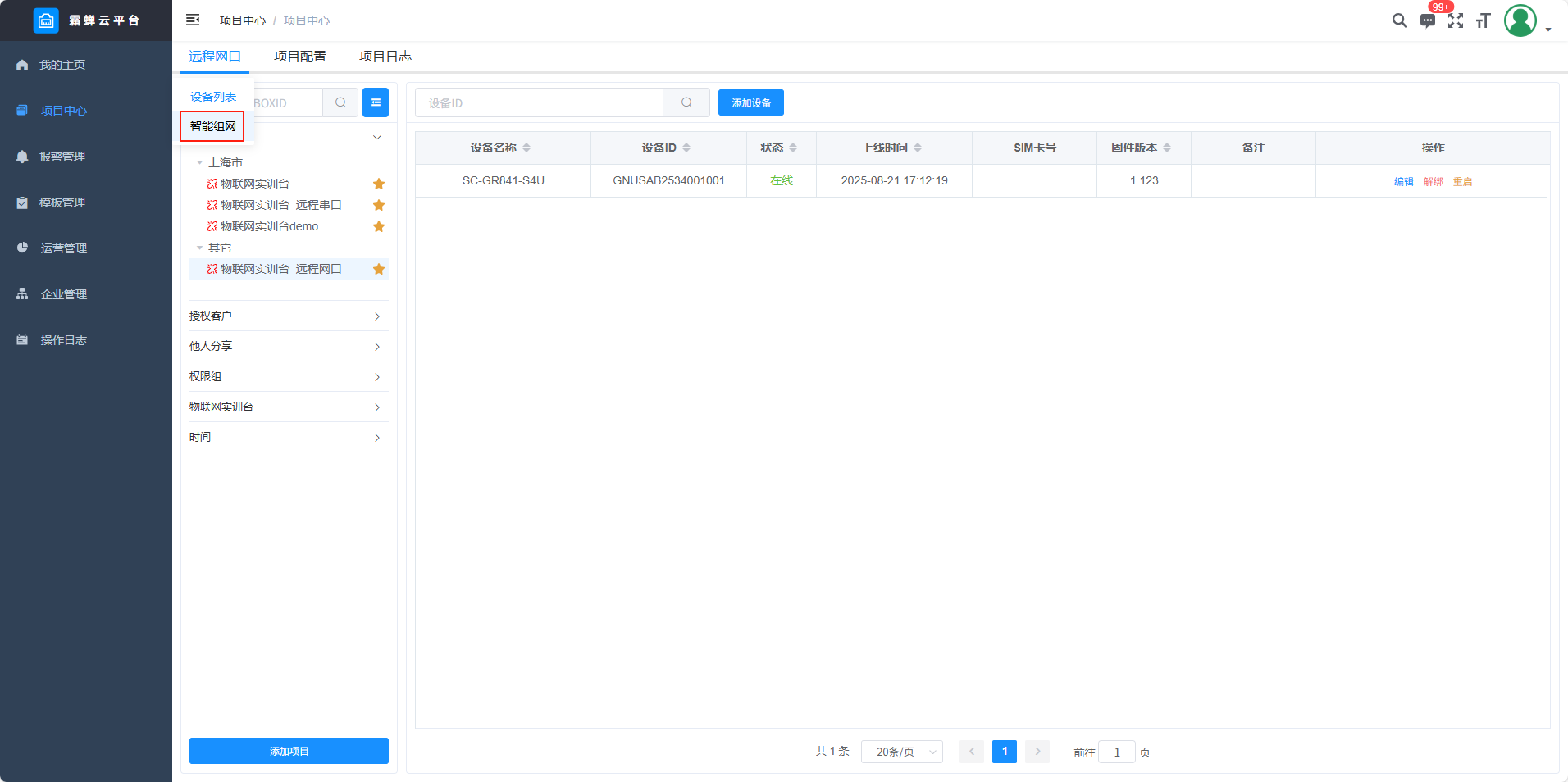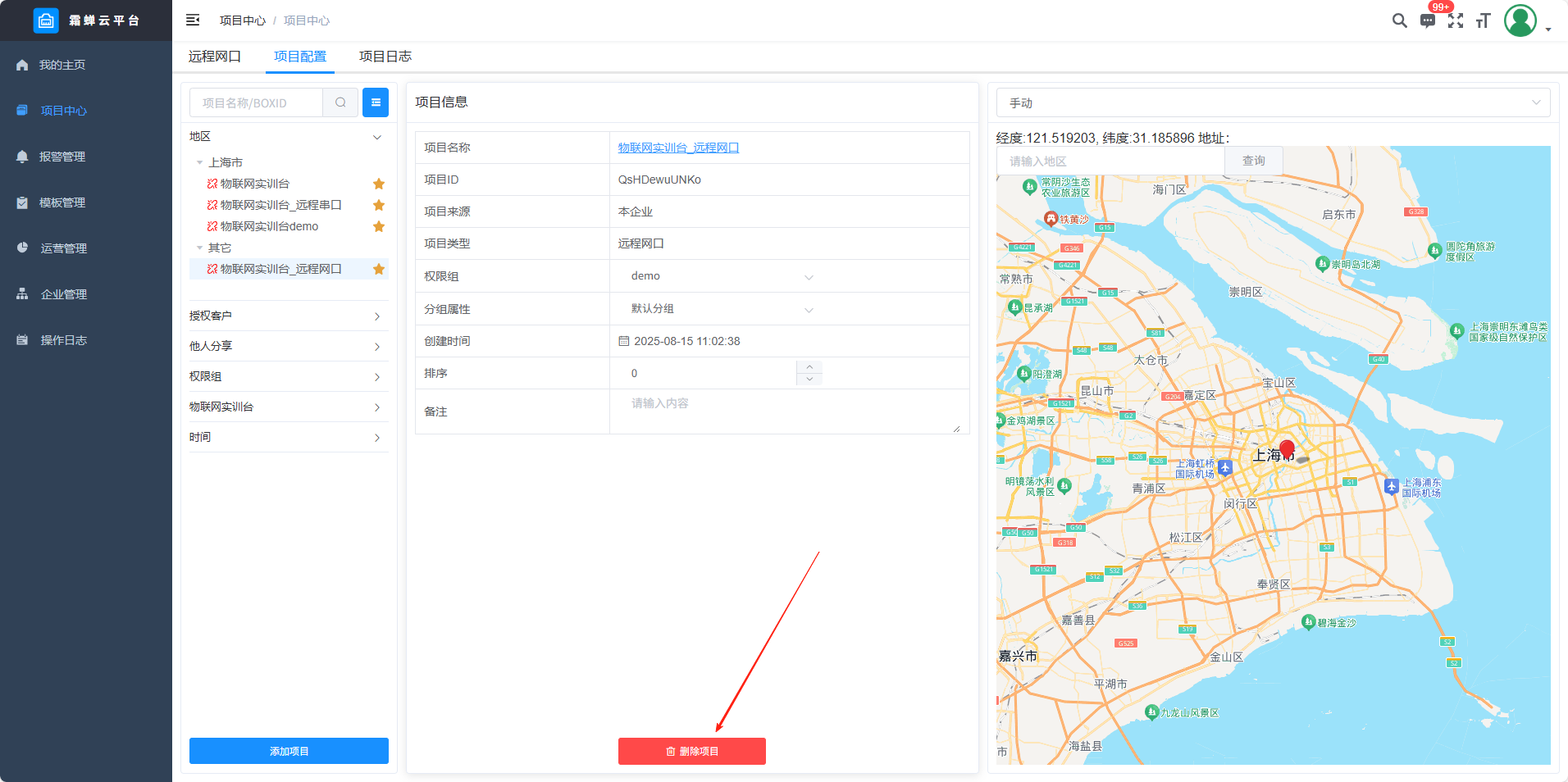 目录 搜索 展开 标准功能云网关系列入门使用流程客户端软件使用说明SC-EdgeConfig路由器功能交换机功能固件升级功能远程编程功能数据采集功能模块防拆功能数据交换功能边缘计算功能OPCUA数据转发MODBUS数据转发IOT功能数据格式default.jsSCIoT.jsTlink.jsOneNET.jsOneJSON.jsAliyun.jsBaidu.jsSC-VCOMSC-SCLink云平台使用说明我的主页项目中心远程串口远程网口远程监控报警管理模板管理运营管理客户管理企业管理操作日志消息中心云组态使用说明准备工作名词解释元素属性分类功能使用新建画面插入背景图片设置背景色插入静态文本显示动态文本指示灯按钮控制(图片按钮)字按钮控制(图片按钮)矢量按钮控制图形变色棒图仪表盘数码管超链接水流效果自定义图库画面跳转实时曲线历史曲线报表报警数子钟视频监控时钟动态文本滚动播放表格批量控制控制变量显示变量数值自定义脚本BOX系列说明SC-GH280使用说明SC-GH380使用说明SC-GH360使用说明API文档token接口基础数据获取项目获取BOX获取设备获取变量数据接口实时数据变量控制获取历史数据获取所有报警活跃报警确认历史报警删除获取报警确认记录获取报警历史记录组态接口获取组态画面OPCDA使用说明OPCUA和MODBUS数据服务视频教程SC-GH380采集西门子串口PLC数据SC-GH380远程编程西门子S7-200-SMART PLCSC-GH380远程编程三菱串口PLCOPCUA数据转发Modbus数据转发边缘计算 暂无相关搜索结果! 阅读次数:65 本文档使用 SchipsDoc 发布 远程网口 远程网口项目中心——添加项目——添加远程网口设备列表智能组网项目配置项目信息 查看及修改项目信息项目名称、权限组、项目状态、创建时间、排序、项目位置和备注。 手动定位在地图上点击位置或者是直接搜索地址。 删除项目项目日志作者:霜蝉科技 创建时间:2025-08-22 08:49最后编辑:scicala 更新时间:2025-09-01 11:09 上一篇: 远程串口下一篇: 远程监控