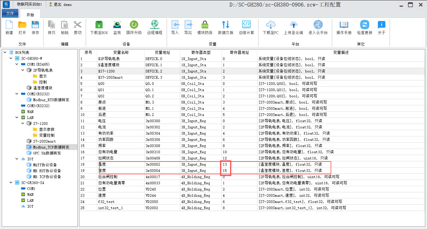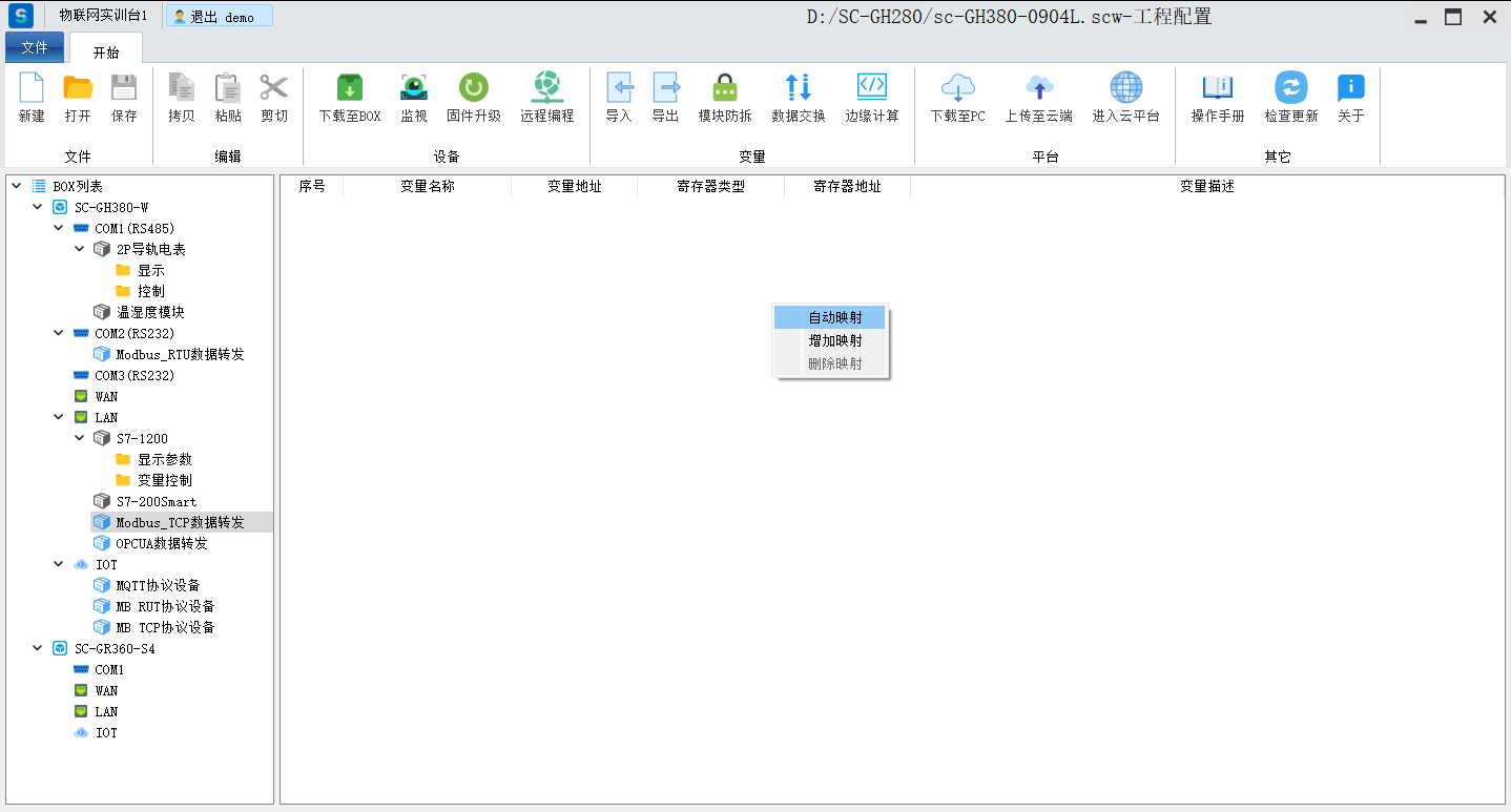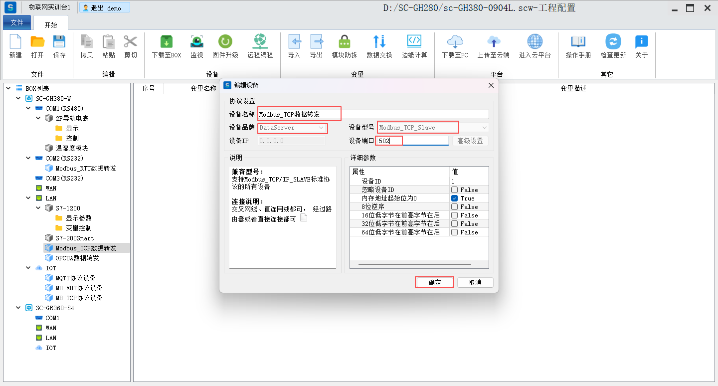 添加Modbus转发协议—>设置转发基础属性—>添加转发变量—>下载至BOX