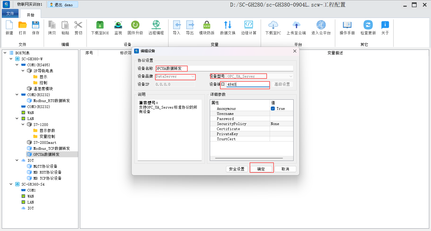 添加转发OPC UA协议—>设置转发基础属性—>添加转发变量—>下载至BOX—>UaExpert添加设置