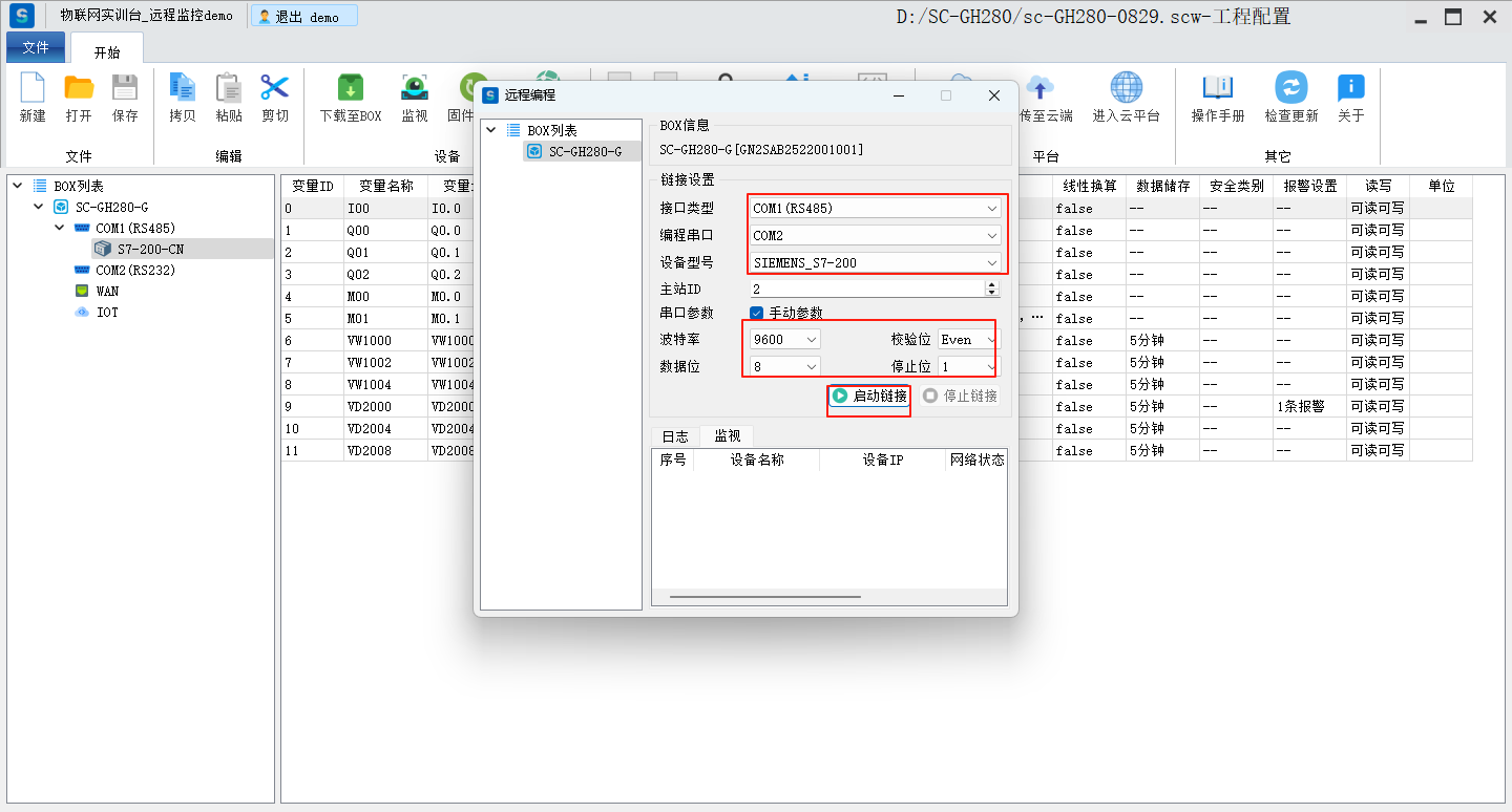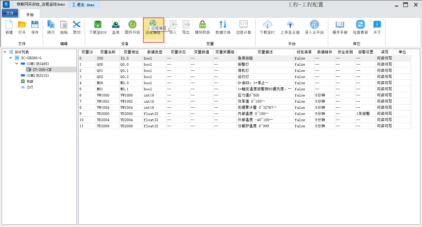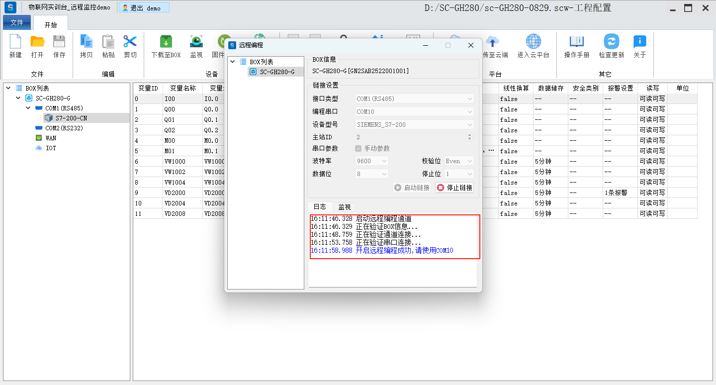目录 搜索 展开 标准功能云网关系列入门使用流程客户端软件使用说明SC-EdgeConfig路由器功能交换机功能固件升级功能远程编程功能数据采集功能模块防拆功能数据交换功能边缘计算功能OPCUA数据转发MODBUS数据转发IOT功能数据格式default.jsSCIoT.jsTlink.jsOneNET.jsOneJSON.jsAliyun.jsBaidu.jsSC-VCOMSC-SCLink云平台使用说明我的主页项目中心远程串口远程网口远程监控报警管理模板管理运营管理客户管理企业管理操作日志消息中心云组态使用说明准备工作名词解释元素属性分类功能使用新建画面插入背景图片设置背景色插入静态文本显示动态文本指示灯按钮控制(图片按钮)字按钮控制(图片按钮)矢量按钮控制图形变色棒图仪表盘数码管超链接水流效果自定义图库画面跳转实时曲线历史曲线报表报警数子钟视频监控时钟动态文本滚动播放表格批量控制控制变量显示变量数值自定义脚本BOX系列说明SC-GH280使用说明SC-GH380使用说明SC-GH360使用说明API文档token接口基础数据获取项目获取BOX获取设备获取变量数据接口实时数据变量控制获取历史数据获取所有报警活跃报警确认历史报警删除获取报警确认记录获取报警历史记录组态接口获取组态画面OPCDA使用说明OPCUA和MODBUS数据服务视频教程SC-GH380采集西门子串口PLC数据SC-GH380远程编程西门子S7-200-SMART PLCSC-GH380远程编程三菱串口PLCOPCUA数据转发Modbus数据转发边缘计算 暂无相关搜索结果! 阅读次数:47 本文档使用 SchipsDoc 发布 远程编程功能 远程编程功能远程编程(以西门子PLC为例)。点击远程编程选择接口类型,选择串口号,选择设备类型,手动设置串口参数,最后点击启动链接。后续PLC软件联机操作请参考远程串口。作者:霜蝉科技 创建时间:2025-09-04 17:33最后编辑:霜蝉科技 更新时间:2025-09-06 13:39 上一篇: 固件升级功能下一篇: 数据采集功能