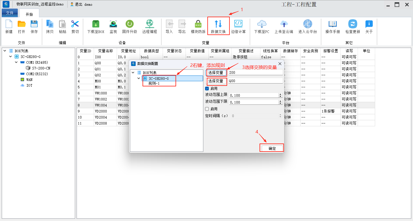 目录 搜索 展开 标准功能云网关系列入门使用流程客户端软件使用说明SC-EdgeConfig路由器功能交换机功能固件升级功能远程编程功能数据采集功能模块防拆功能数据交换功能边缘计算功能OPCUA数据转发MODBUS数据转发IOT功能数据格式default.jsSCIoT.jsTlink.jsOneNET.jsOneJSON.jsAliyun.jsBaidu.jsSC-VCOMSC-SCLink云平台使用说明我的主页项目中心远程串口远程网口远程监控报警管理模板管理运营管理客户管理企业管理操作日志消息中心云组态使用说明准备工作名词解释元素属性分类功能使用新建画面插入背景图片设置背景色插入静态文本显示动态文本指示灯按钮控制(图片按钮)字按钮控制(图片按钮)矢量按钮控制图形变色棒图仪表盘数码管超链接水流效果自定义图库画面跳转实时曲线历史曲线报表报警数子钟视频监控时钟动态文本滚动播放表格批量控制控制变量显示变量数值自定义脚本BOX系列说明SC-GH280使用说明SC-GH380使用说明SC-GH360使用说明API文档token接口基础数据获取项目获取BOX获取设备获取变量数据接口实时数据变量控制获取历史数据获取所有报警活跃报警确认历史报警删除获取报警确认记录获取报警历史记录组态接口获取组态画面OPCDA使用说明OPCUA和MODBUS数据服务视频教程SC-GH380采集西门子串口PLC数据SC-GH380远程编程西门子S7-200-SMART PLCSC-GH380远程编程三菱串口PLCOPCUA数据转发Modbus数据转发边缘计算 暂无相关搜索结果! 阅读次数:56 本文档使用 SchipsDoc 发布 数据交换功能 数据交换功能将一个PLC的变量传送到同一个PLC的其他变量或另外一个PLC变量,通过这个功能让连接到同一个网关的两个PLC数据交换。数据传输时单向的,即:源变量—> 目标变量。操作方法如下、点击“数据交换”,在弹出框里点击“添加规则”波动范围上下限:默认开启,当数值变化超过上限或者低于下限,源地址变量向目标地址传送一次数据定时间隔:建议启用,建议周期设置10s。作者:霜蝉科技 创建时间:2025-09-04 17:40最后编辑:霜蝉科技 更新时间:2025-09-06 13:39 上一篇: 模块防拆功能下一篇: 边缘计算功能