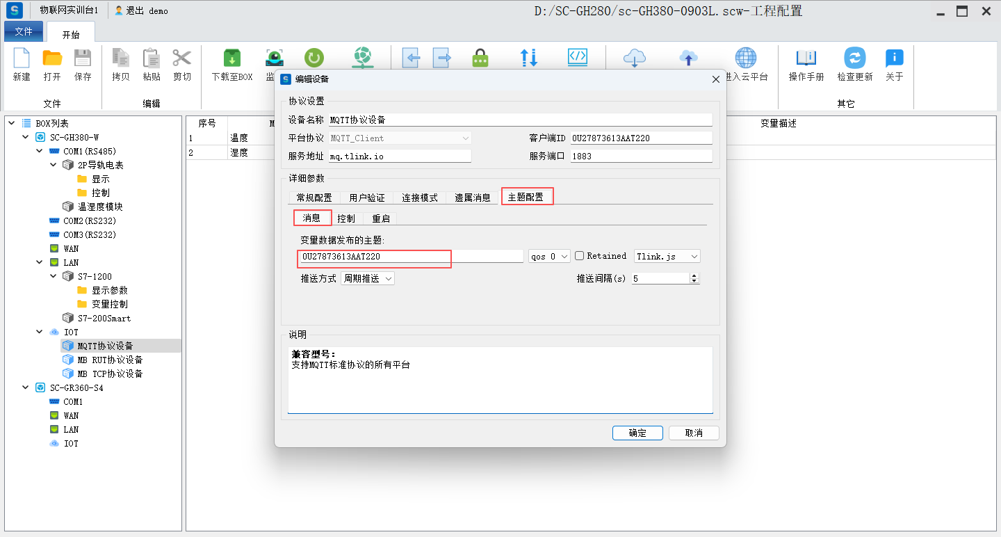 发布主题:设备序列号,指设备发布上行数据到平台的主题。。