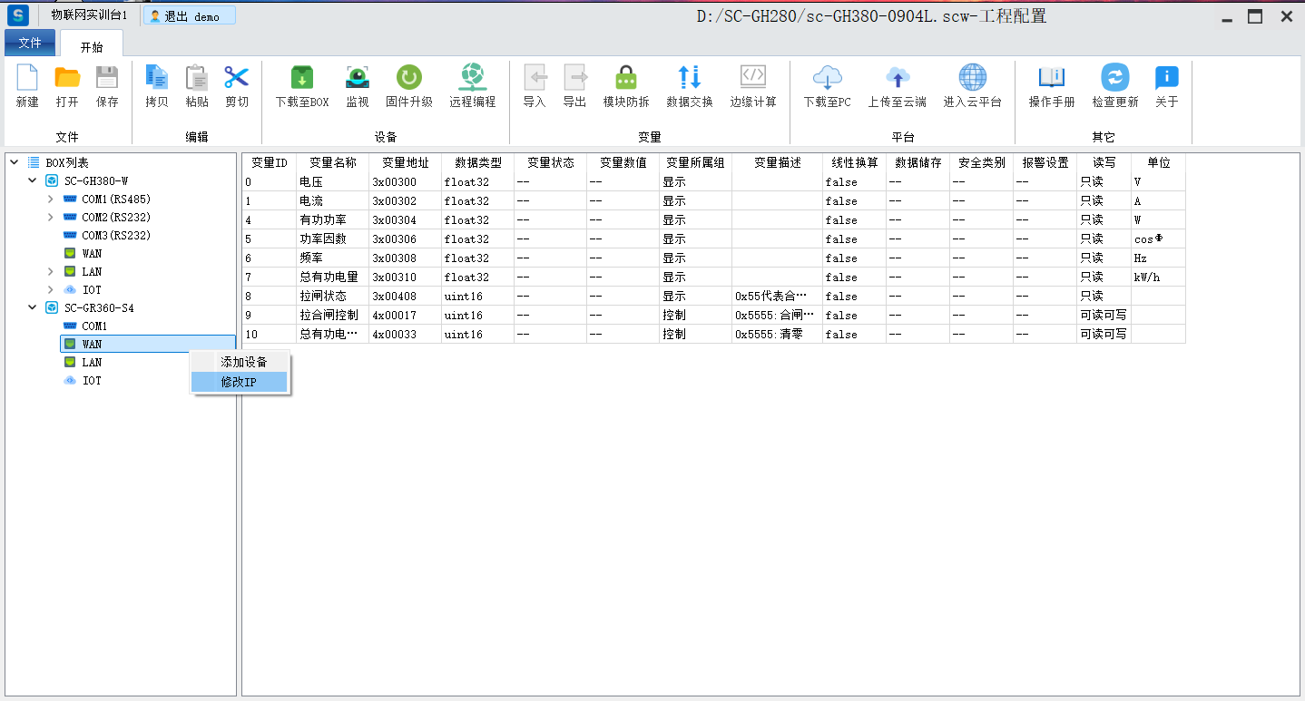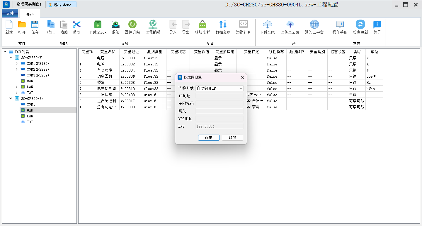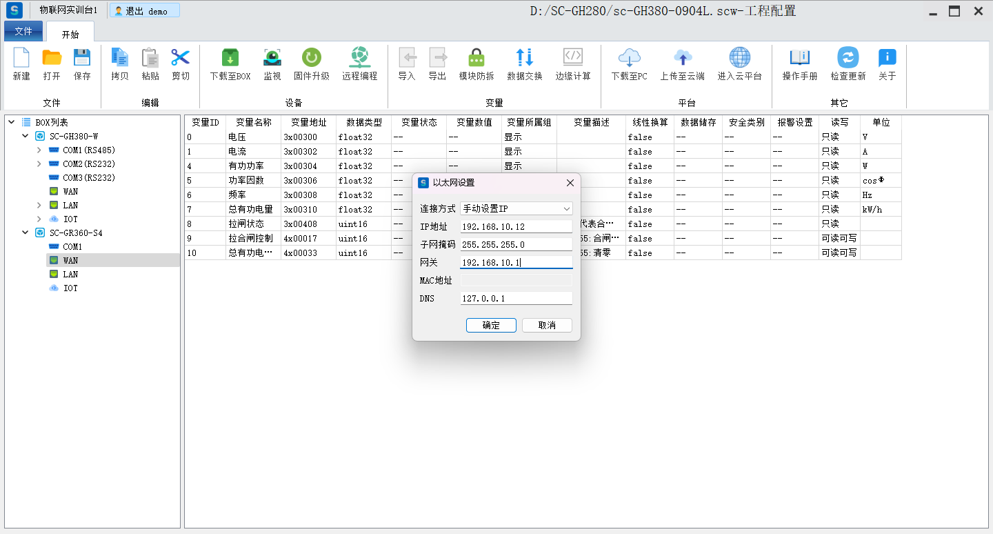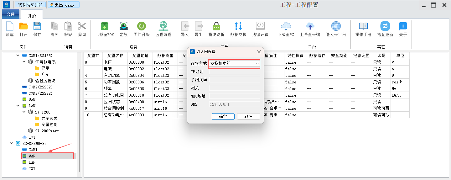 目录 搜索 展开 标准功能云网关系列入门使用流程客户端软件使用说明SC-EdgeConfig路由器功能交换机功能固件升级功能远程编程功能数据采集功能模块防拆功能数据交换功能边缘计算功能OPCUA数据转发MODBUS数据转发IOT功能数据格式default.jsSCIoT.jsTlink.jsOneNET.jsOneJSON.jsAliyun.jsBaidu.jsSC-VCOMSC-SCLink云平台使用说明我的主页项目中心远程串口远程网口远程监控报警管理模板管理运营管理客户管理企业管理操作日志消息中心云组态使用说明准备工作名词解释元素属性分类功能使用新建画面插入背景图片设置背景色插入静态文本显示动态文本指示灯按钮控制(图片按钮)字按钮控制(图片按钮)矢量按钮控制图形变色棒图仪表盘数码管超链接水流效果自定义图库画面跳转实时曲线历史曲线报表报警数子钟视频监控时钟动态文本滚动播放表格批量控制控制变量显示变量数值自定义脚本BOX系列说明SC-GH280使用说明SC-GH380使用说明SC-GH360使用说明API文档token接口基础数据获取项目获取BOX获取设备获取变量数据接口实时数据变量控制获取历史数据获取所有报警活跃报警确认历史报警删除获取报警确认记录获取报警历史记录组态接口获取组态画面OPCDA使用说明OPCUA和MODBUS数据服务视频教程SC-GH380采集西门子串口PLC数据SC-GH380远程编程西门子S7-200-SMART PLCSC-GH380远程编程三菱串口PLCOPCUA数据转发Modbus数据转发边缘计算 暂无相关搜索结果! 阅读次数:67 本文档使用 SchipsDoc 发布 交换机功能 交换机功能点击WAN,右键修改IP手动设置IP,自动获取IP开启交换机功能设置此功能后,WAN IP 和LAN IP 相同。主要用于BOX物联网卡或者wifi方式上网。作者:霜蝉科技 创建时间:2025-09-04 17:53最后编辑:霜蝉科技 更新时间:2025-09-06 13:38上一篇: 路由器功能下一篇: 固件升级功能