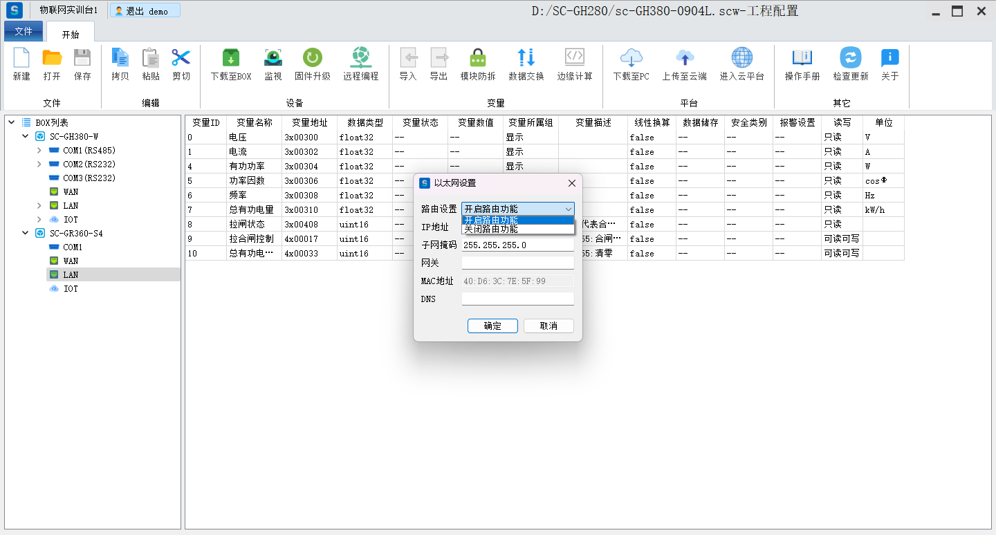 目录 搜索 展开 标准功能云网关系列入门使用流程客户端软件使用说明SC-EdgeConfig路由器功能交换机功能固件升级功能远程编程功能数据采集功能模块防拆功能数据交换功能边缘计算功能OPCUA数据转发MODBUS数据转发IOT功能数据格式default.jsSCIoT.jsTlink.jsOneNET.jsOneJSON.jsAliyun.jsBaidu.jsSC-VCOMSC-SCLink云平台使用说明我的主页项目中心远程串口远程网口远程监控报警管理模板管理运营管理客户管理企业管理操作日志消息中心云组态使用说明准备工作名词解释元素属性分类功能使用新建画面插入背景图片设置背景色插入静态文本显示动态文本指示灯按钮控制(图片按钮)字按钮控制(图片按钮)矢量按钮控制图形变色棒图仪表盘数码管超链接水流效果自定义图库画面跳转实时曲线历史曲线报表报警数子钟视频监控时钟动态文本滚动播放表格批量控制控制变量显示变量数值自定义脚本BOX系列说明SC-GH280使用说明SC-GH380使用说明SC-GH360使用说明API文档token接口基础数据获取项目获取BOX获取设备获取变量数据接口实时数据变量控制获取历史数据获取所有报警活跃报警确认历史报警删除获取报警确认记录获取报警历史记录组态接口获取组态画面OPCDA使用说明OPCUA和MODBUS数据服务视频教程SC-GH380采集西门子串口PLC数据SC-GH380远程编程西门子S7-200-SMART PLCSC-GH380远程编程三菱串口PLCOPCUA数据转发Modbus数据转发边缘计算 暂无相关搜索结果! 阅读次数:60 本文档使用 SchipsDoc 发布 路由器功能 路由器功能功能说明:BOX使用4G方式上网,选择此项,具备4G路由功能,通过运营商4G网络WCDMA、TD-SCDMA进行拨号连网,就可以实现数据传输,上网等。点击LAN,右键修改IP作者:霜蝉科技 创建时间:2025-09-04 17:54最后编辑:霜蝉科技 更新时间:2025-09-06 13:37上一篇: SC-EdgeConfig下一篇: 交换机功能