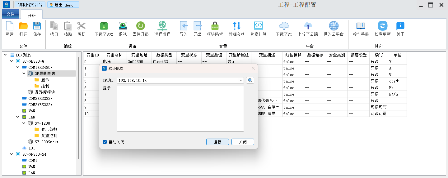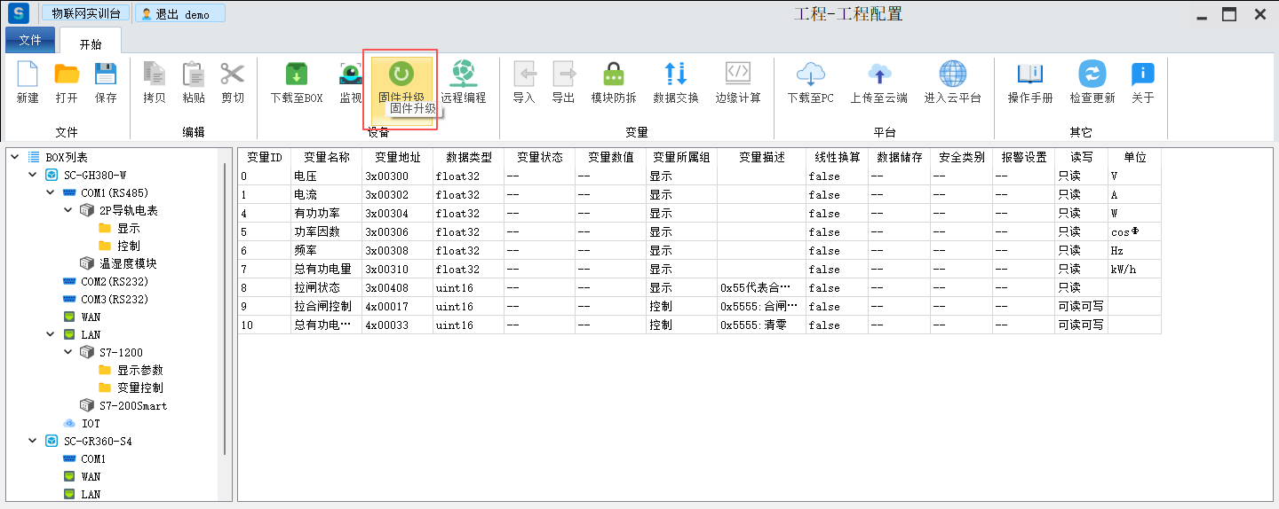 目录 搜索 展开 标准功能云网关系列入门使用流程客户端软件使用说明SC-EdgeConfig路由器功能交换机功能固件升级功能远程编程功能数据采集功能模块防拆功能数据交换功能边缘计算功能OPCUA数据转发MODBUS数据转发IOT功能数据格式default.jsSCIoT.jsTlink.jsOneNET.jsOneJSON.jsAliyun.jsBaidu.jsSC-VCOMSC-SCLink云平台使用说明我的主页项目中心远程串口远程网口远程监控报警管理模板管理运营管理客户管理企业管理操作日志消息中心云组态使用说明准备工作名词解释元素属性分类功能使用新建画面插入背景图片设置背景色插入静态文本显示动态文本指示灯按钮控制(图片按钮)字按钮控制(图片按钮)矢量按钮控制图形变色棒图仪表盘数码管超链接水流效果自定义图库画面跳转实时曲线历史曲线报表报警数子钟视频监控时钟动态文本滚动播放表格批量控制控制变量显示变量数值自定义脚本BOX系列说明SC-GH280使用说明SC-GH380使用说明SC-GH360使用说明API文档token接口基础数据获取项目获取BOX获取设备获取变量数据接口实时数据变量控制获取历史数据获取所有报警活跃报警确认历史报警删除获取报警确认记录获取报警历史记录组态接口获取组态画面OPCDA使用说明OPCUA和MODBUS数据服务视频教程SC-GH380采集西门子串口PLC数据SC-GH380远程编程西门子S7-200-SMART PLCSC-GH380远程编程三菱串口PLCOPCUA数据转发Modbus数据转发边缘计算 暂无相关搜索结果! 阅读次数:52 本文档使用 SchipsDoc 发布 固件升级功能 固件升级使用网线连接BOX和电脑,并且电脑IP 设置和BOX在一个网段。点击“固件升级”选择固件升级文件点击连接,等待升级。作者:霜蝉科技 创建时间:2025-09-05 16:54最后编辑:霜蝉科技 更新时间:2025-09-05 16:55 上一篇: 交换机功能下一篇: 远程编程功能