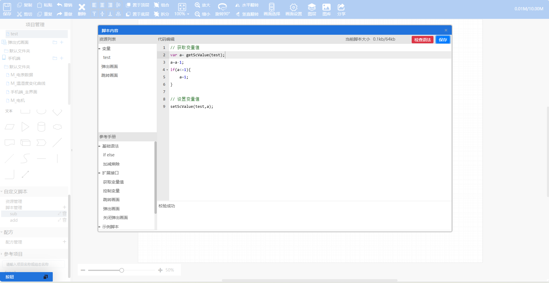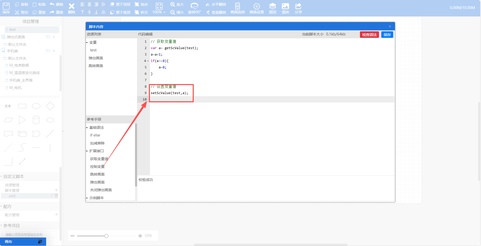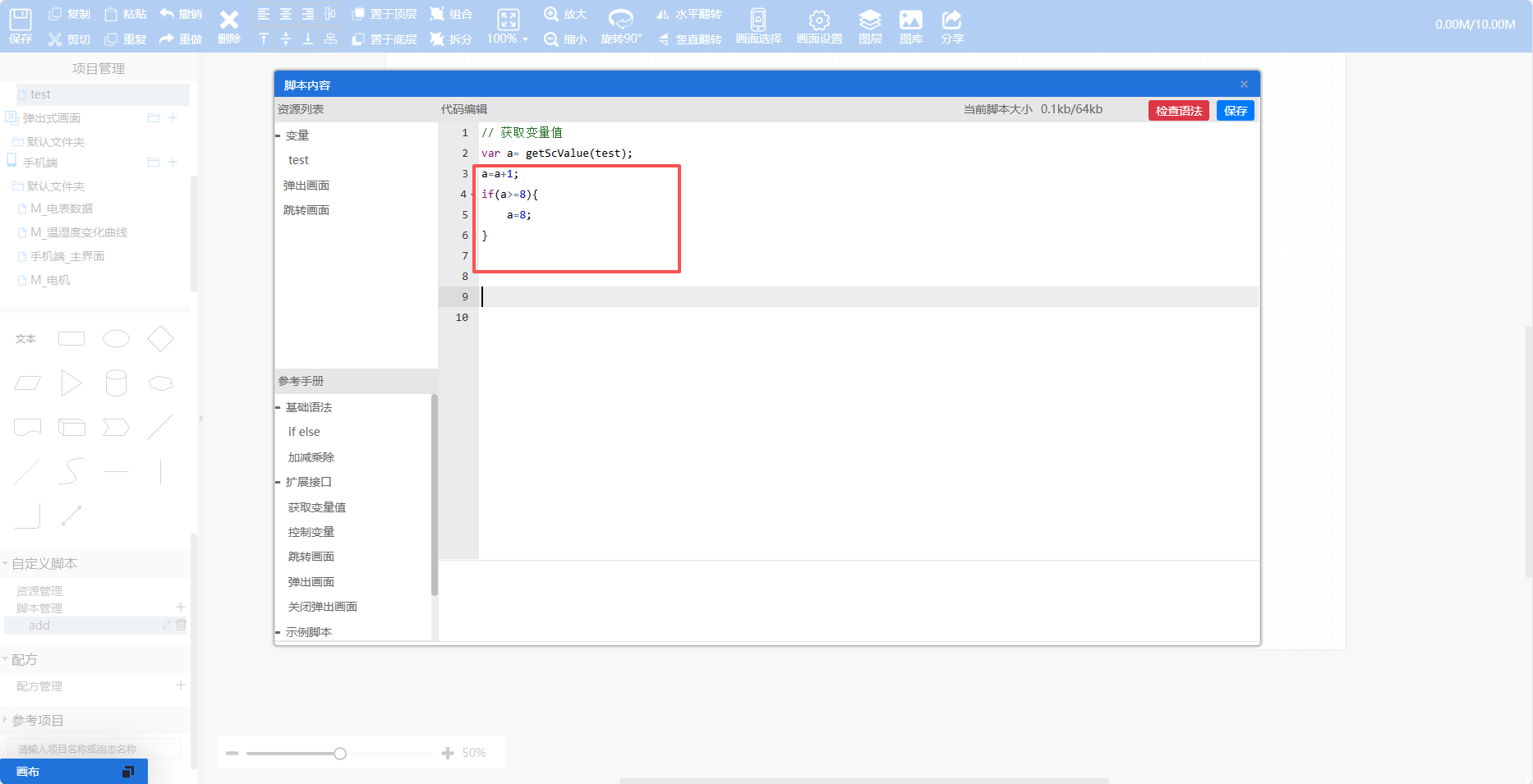 目录 搜索 展开 标准功能云网关系列入门使用流程客户端软件使用说明SC-EdgeConfig路由器功能交换机功能固件升级功能远程编程功能数据采集功能模块防拆功能数据交换功能边缘计算功能OPCUA数据转发MODBUS数据转发IOT功能数据格式default.jsSCIoT.jsTlink.jsOneNET.jsOneJSON.jsAliyun.jsBaidu.jsSC-VCOMSC-SCLink云平台使用说明我的主页项目中心远程串口远程网口远程监控报警管理模板管理运营管理客户管理企业管理操作日志消息中心云组态使用说明准备工作名词解释元素属性分类功能使用新建画面插入背景图片设置背景色插入静态文本显示动态文本指示灯按钮控制(图片按钮)字按钮控制(图片按钮)矢量按钮控制图形变色棒图仪表盘数码管超链接水流效果自定义图库画面跳转实时曲线历史曲线报表报警数子钟视频监控时钟动态文本滚动播放表格批量控制控制变量显示变量数值自定义脚本BOX系列说明SC-GH280使用说明SC-GH380使用说明SC-GH360使用说明API文档token接口基础数据获取项目获取BOX获取设备获取变量数据接口实时数据变量控制获取历史数据获取所有报警活跃报警确认历史报警删除获取报警确认记录获取报警历史记录组态接口获取组态画面OPCDA使用说明OPCUA和MODBUS数据服务视频教程SC-GH380采集西门子串口PLC数据SC-GH380远程编程西门子S7-200-SMART PLCSC-GH380远程编程三菱串口PLCOPCUA数据转发Modbus数据转发边缘计算 暂无相关搜索结果! 阅读次数:53 本文档使用 SchipsDoc 发布 自定义脚本 示例:每按一次按钮,变量自增1,最大8,按另一个按钮,变量自减1,最小1添加资源名称,类型添加脚本获取变量的值代码实现功能设置变量值,检查语法,保存新建画面,添加按钮,关联变量自减操作相同,只是代码不同这样能实现便能每按一次按钮,变量自增1,最大8,按另一个按钮,变量自减1,最小1作者:霜蝉科技 创建时间:2025-09-28 09:50最后编辑:霜蝉科技 更新时间:2025-09-29 09:16 上一篇: 显示变量数值下一篇: BOX系列说明