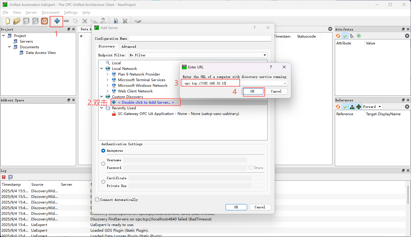 点击左上角的+号,然后点击Custom Discovery,双击+号